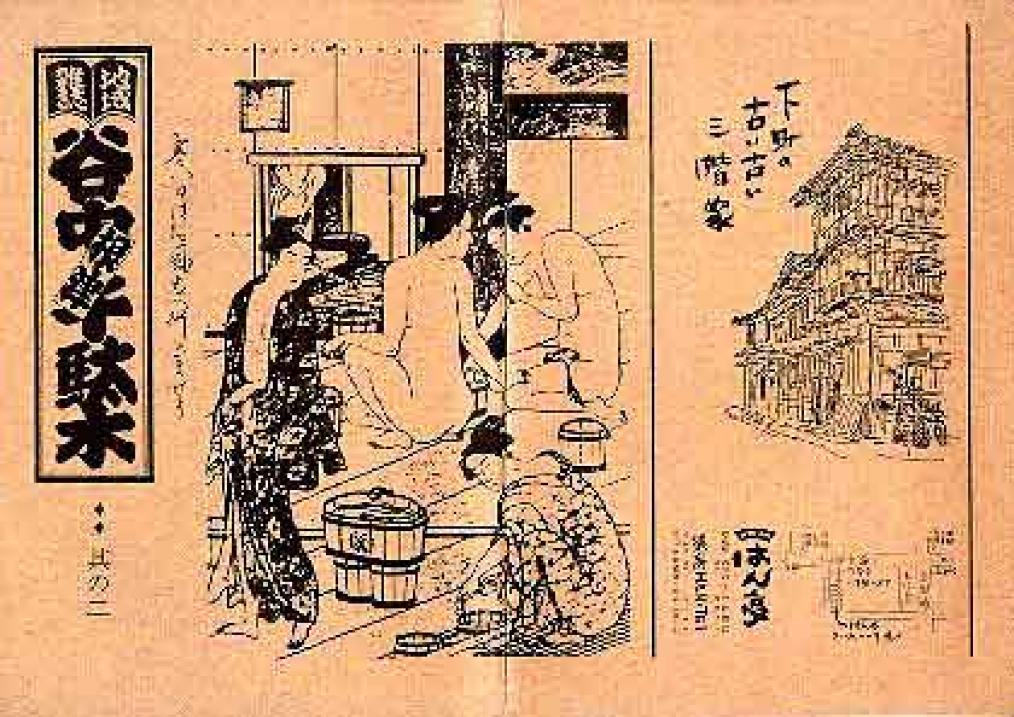 火事を出さぬよう、江戸ではいかなる大家といえど、町人は内風呂を許されない。そこで、銭湯が大はやり。ことに職人は何をおいても朝湯へ行く。歯楊子をくわえ、方へ手ぬぐいをのせ、草履をつっかけてそりゃ粋なもの。人が集まれば世間話に花が咲く。お上は必ず銭湯に密偵を張り込ませて情報収集したぐらい。