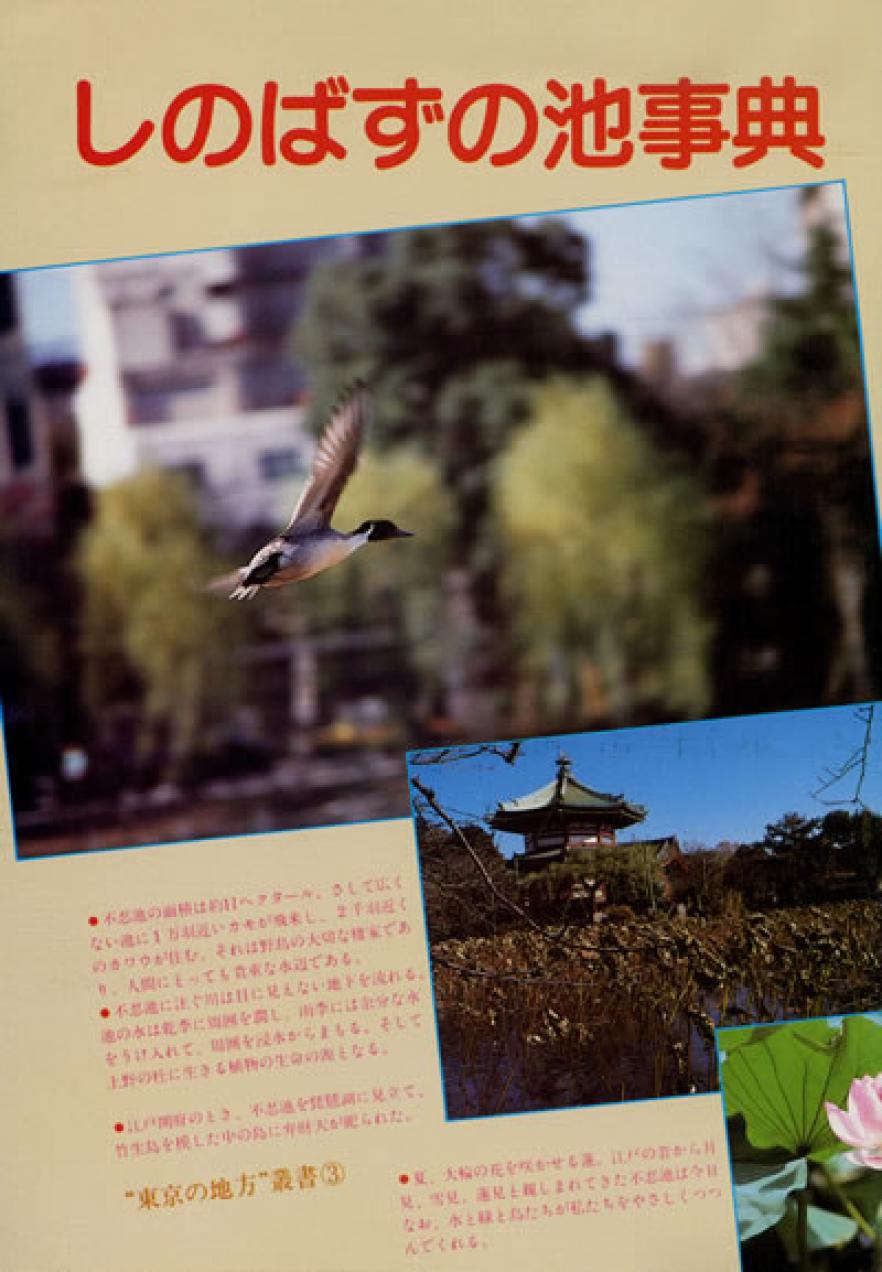 活動の中で、この地域の「親しまれる環境」を調査しますと、路地・銭湯・せんべい屋・植木鉢といったミクロでより身近な環境と同時に、マクロな、広い地域にわたるシンボル的な存在として、上野公園や不忍池、いまはない谷中五重塔なども住民に強く”親しまれている”ことがわかりました。そこで「谷中五重塔事典」につづき、現在、地下駐車場と自然環境が問われている「しのばずの池事典」を発行いたします。