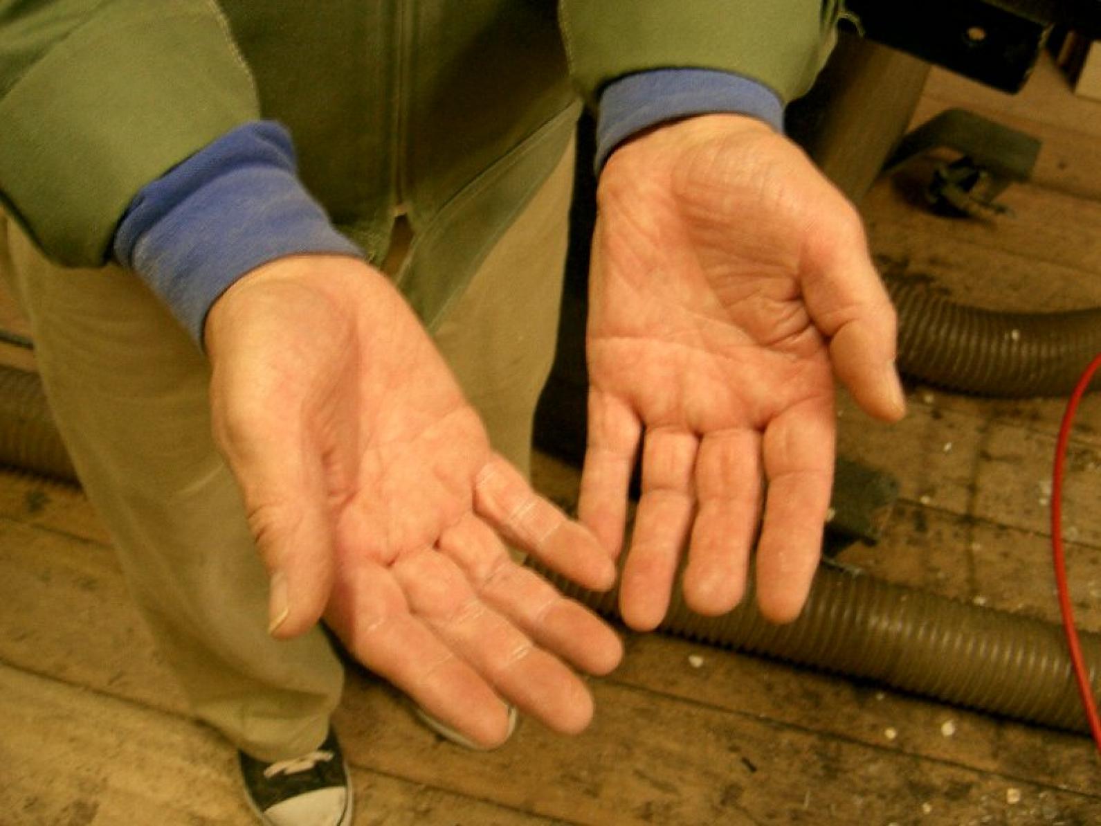晴さん61歳、清ちゃん67歳、佐々木さん66歳。木工3人の手に触れさせてもらうと、ともに柔らかい。