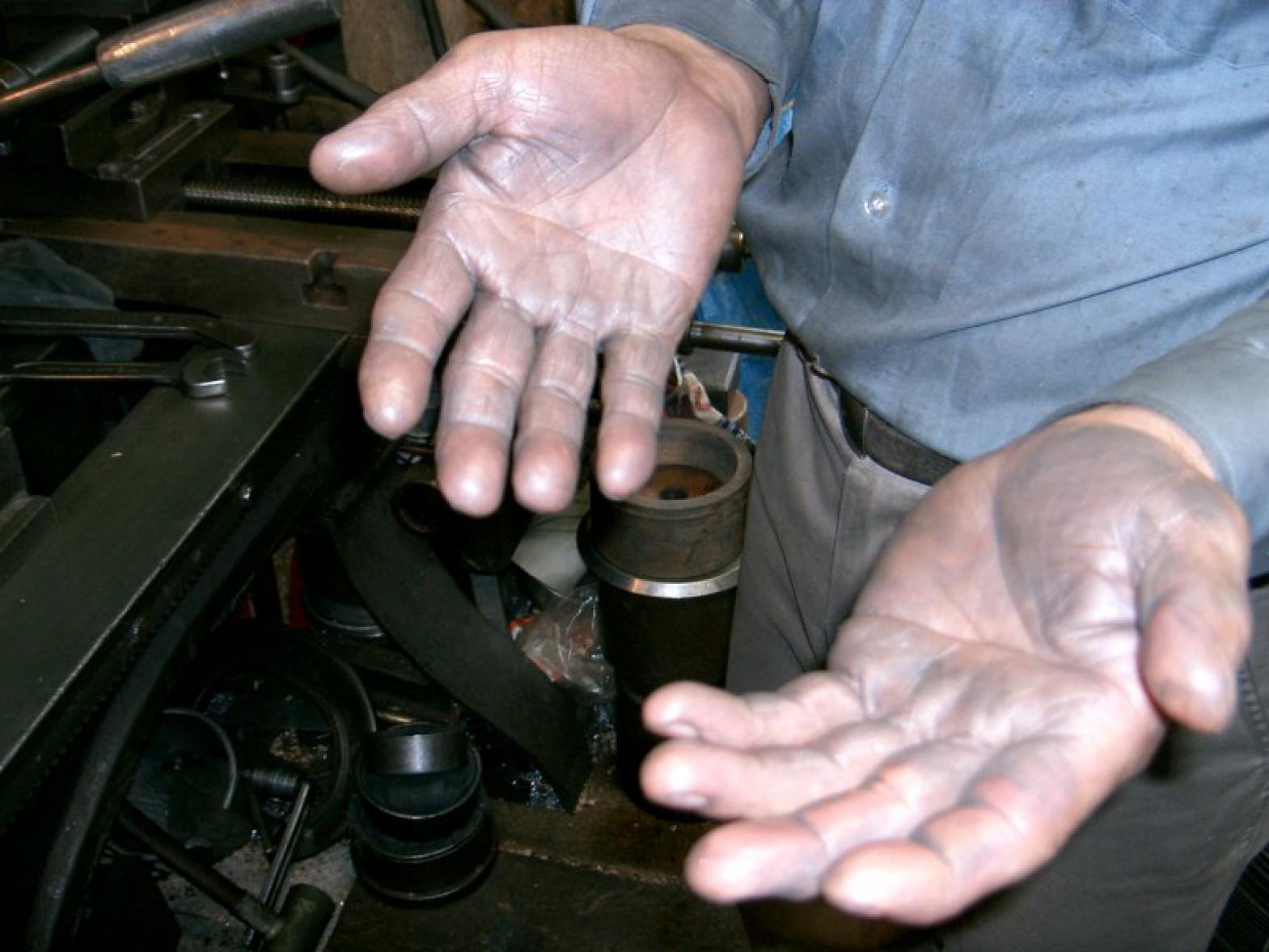 午前十時の休憩で既に午後三時の休憩時と同じだけ黒くなるので、始業してから、たった一時間で一日分の汚れがつくようだ。