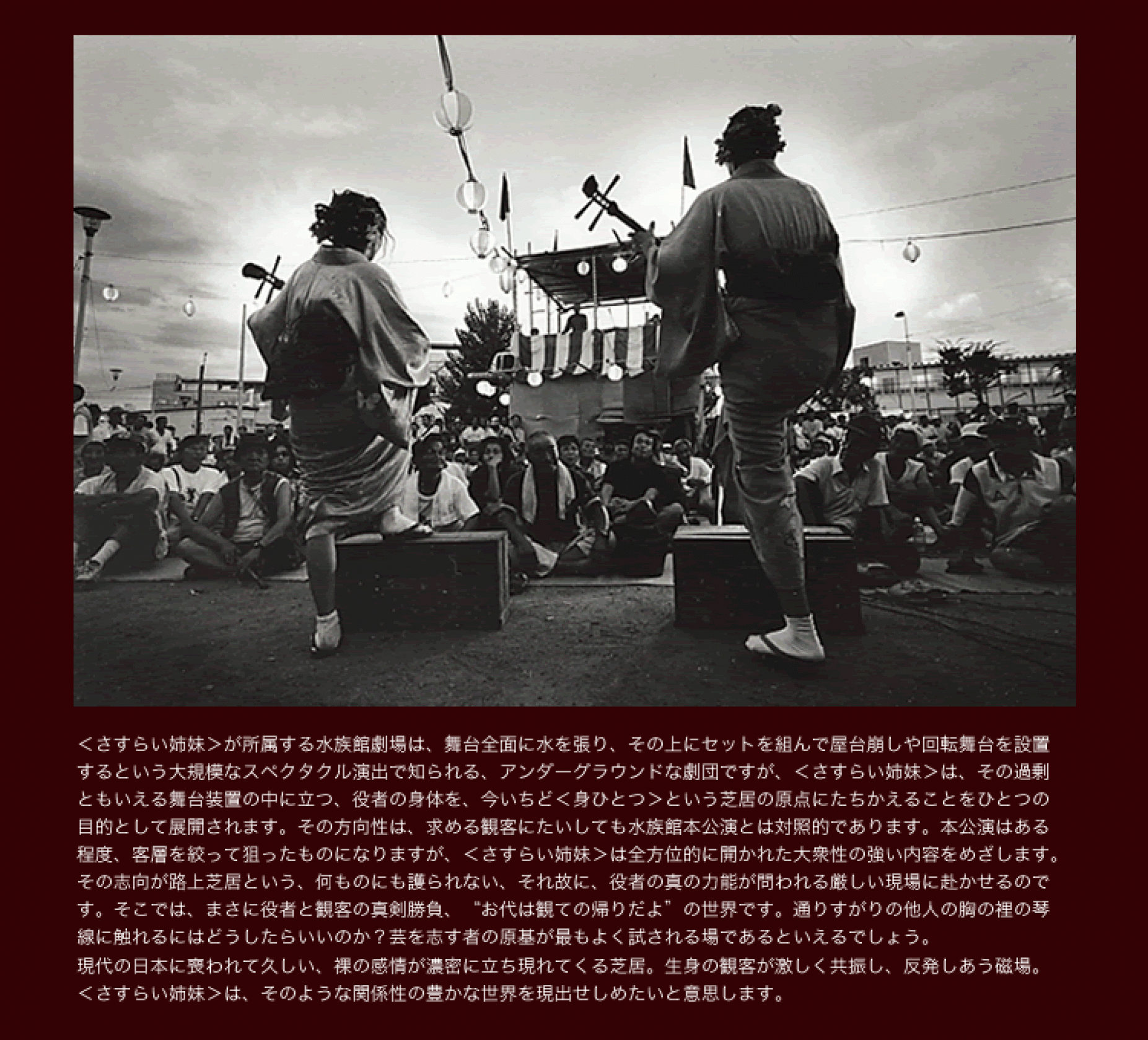 ¡¡¤È¤¤¤Ã¤Æ¤â¡¢¤â¤Á¤í¤ó¡¢¤Û¤¦¤í¤¦¤Î¸®Àè¤Ë¥Æ¥ó¥È¤òÁȤó¤À¤ê¡¢Å¹Æâ¤ò¿å¤Ç°î¤ì¤µ¤»¤¿¤ê¤Ï¤Ç¤¤Þ¤»¤ó¡£¤½¤³¤Ç¡¢ËèǯǯËöǯ»Ï¡¢Èà¤é¤¬´ó¤»¾ì¤ÎÏ©¾å¤Ç±é¤¸¤Æ¤¤¤ë¡Ö¤µ¤¹¤é¤¤»ÐËå¡×¤Ç¤Î¸ø±é¤ò¤·¤Æ¤¤¤¿¤À¤¯¤³¤È¤Ë¤Ê¤ê¤Þ¤·¤¿¡£±éÌܤϡذÈÇÏÅ·¶é¡Ù¤Ç¤¹¡£