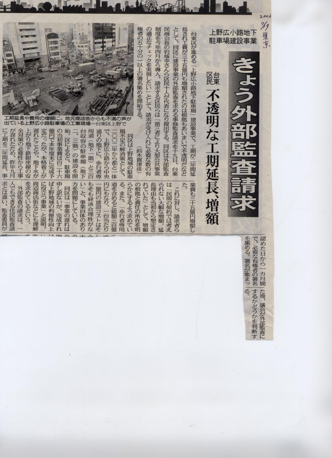 「上野広小路地下駐車場」の工事延長、工事費増額には疑問があるとして、台東区住民の有志が外部監査請求署名をはじめた。