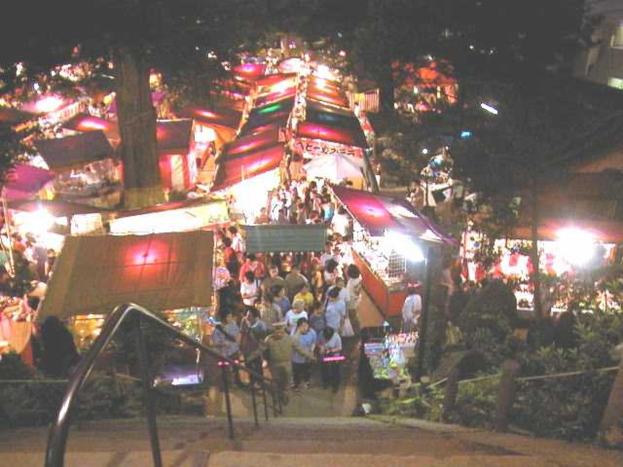 神社の山の上から見る夜店