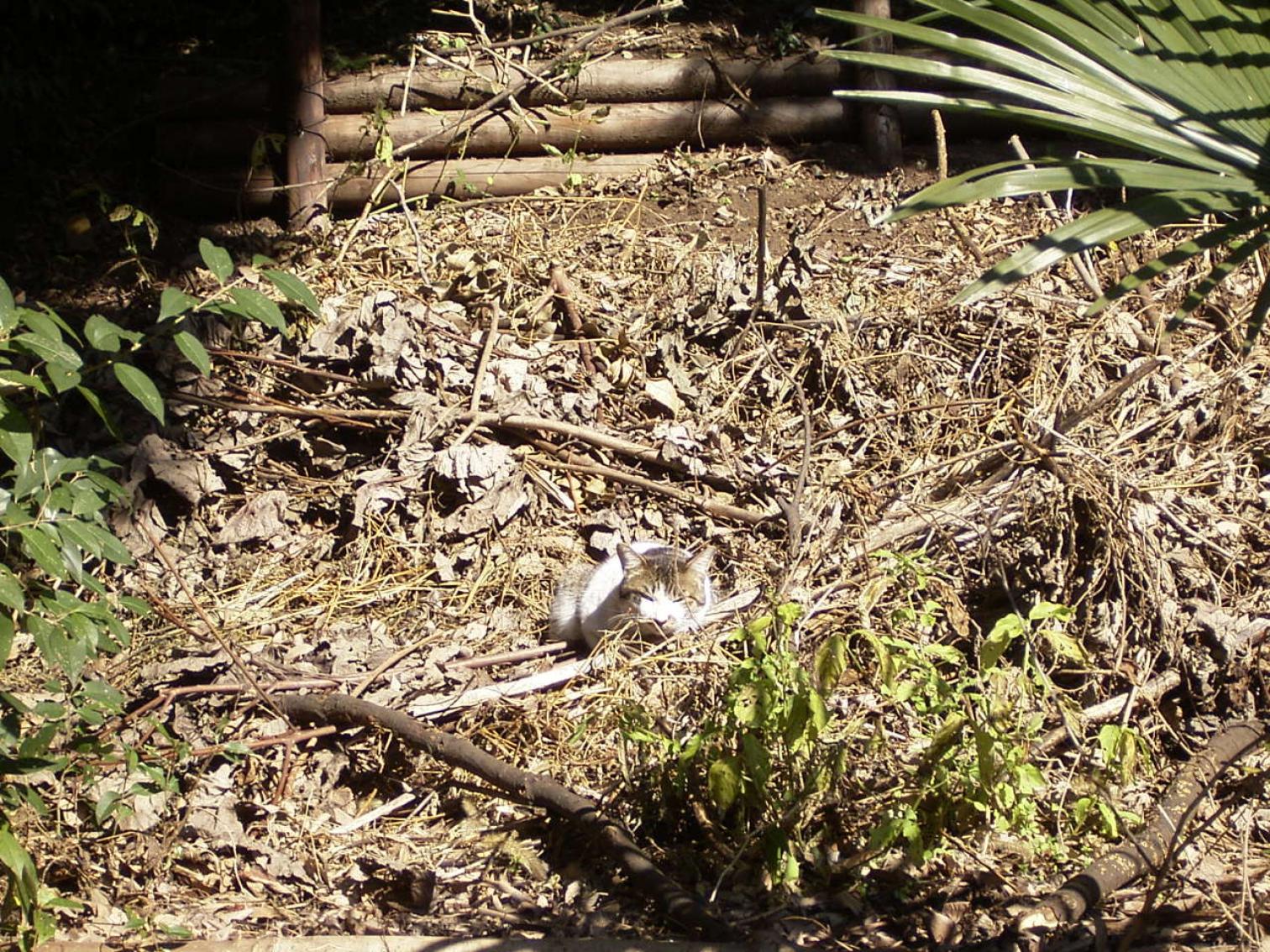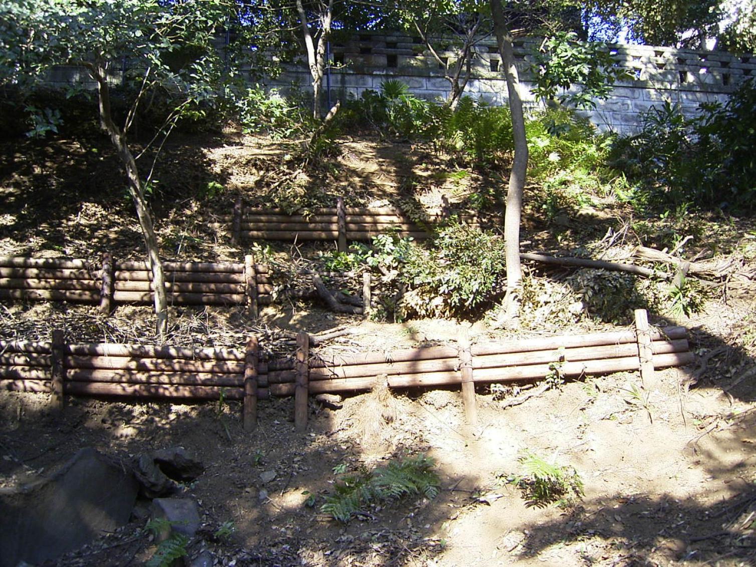 ◎スダジイの大木の朽ちた枝と、隣家の塀を越えそうな枝の剪定した枝を使って、土留めの補強をしました。
