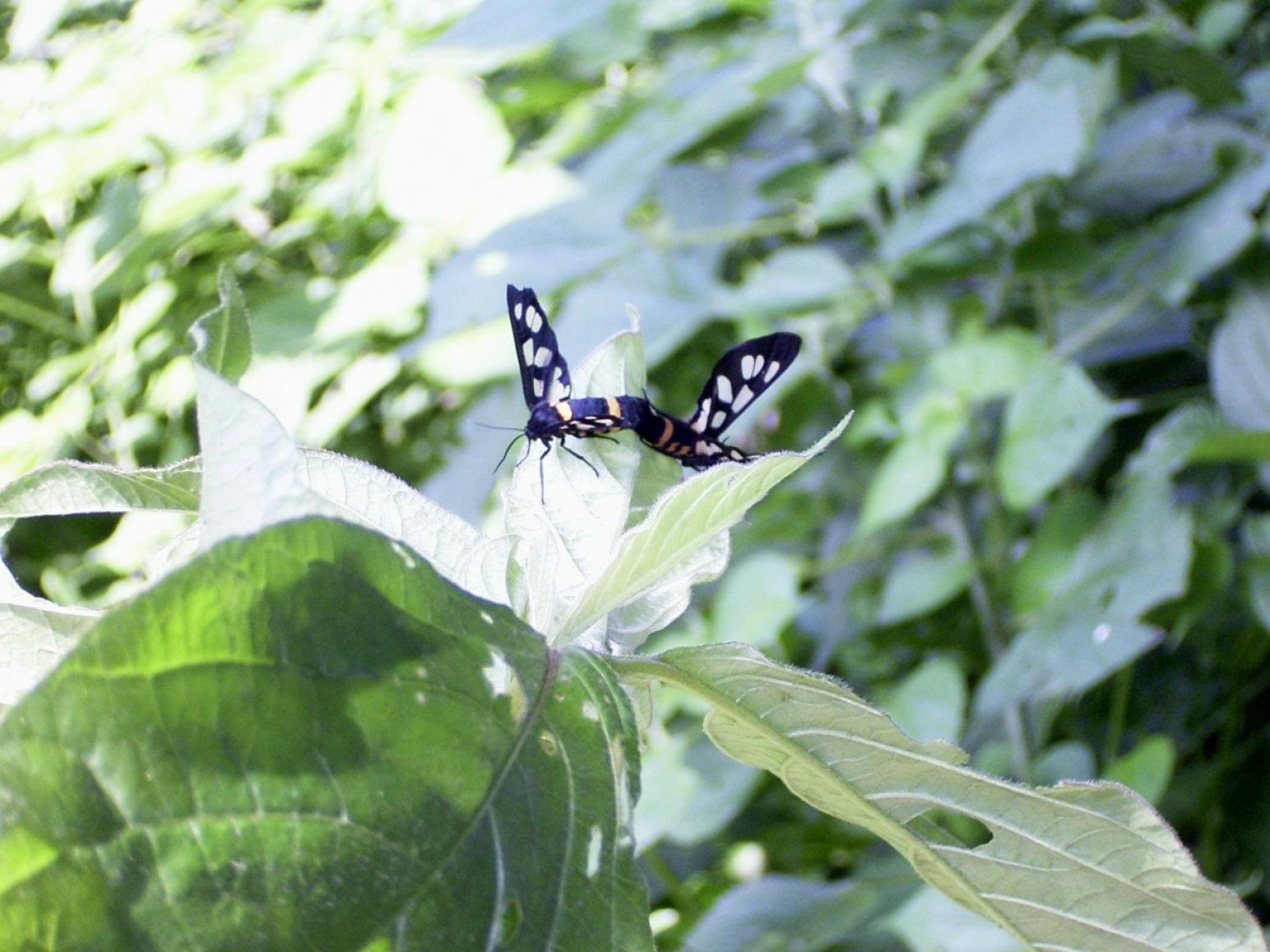 ちょうど交尾の個体ですね。この蛾は、昼間に行動するのでよく見ることができます。お腹の黄色と黒の縞模様はハチの擬態かもしれません、