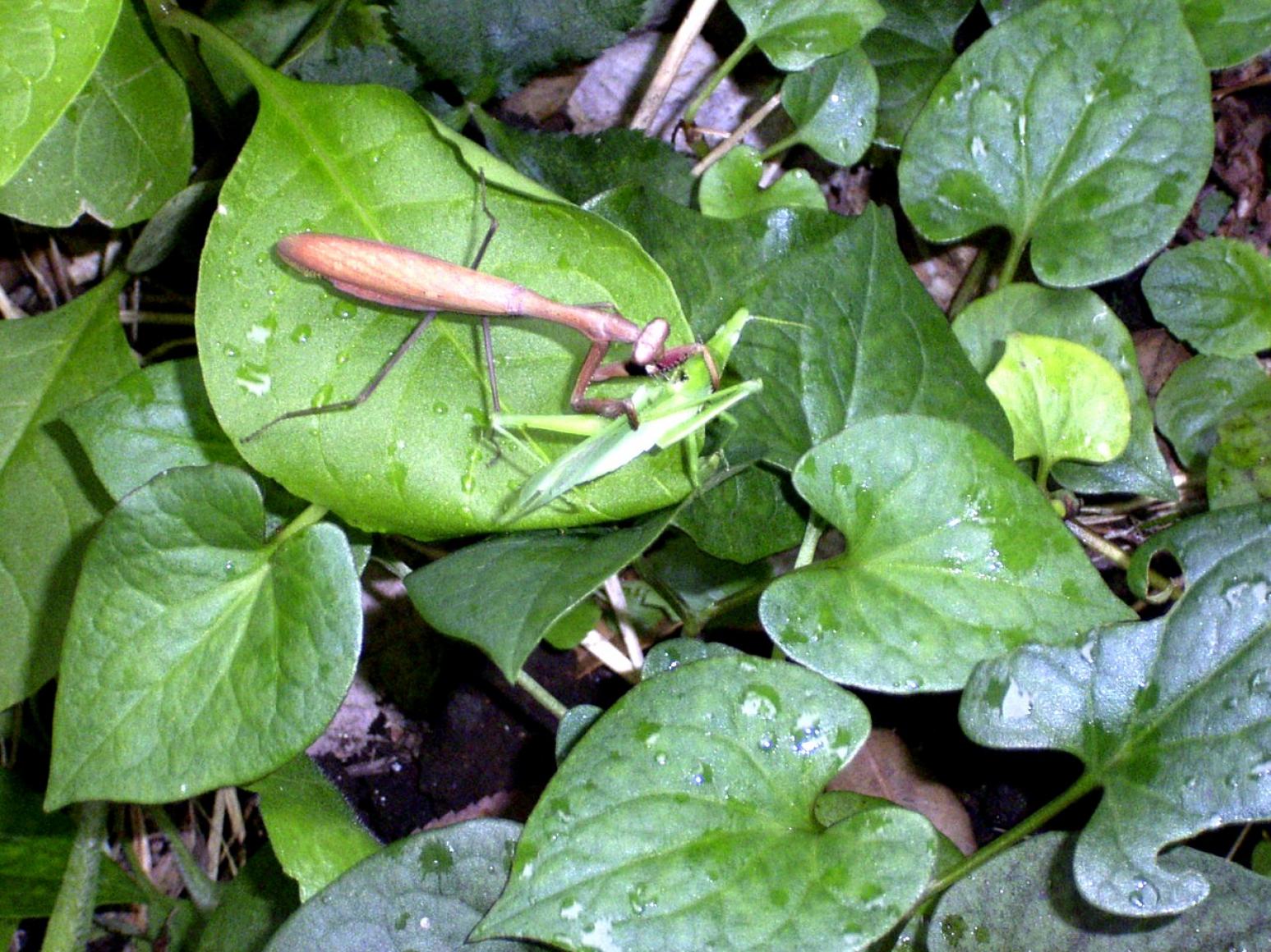 食事中の茶色のカマキリ