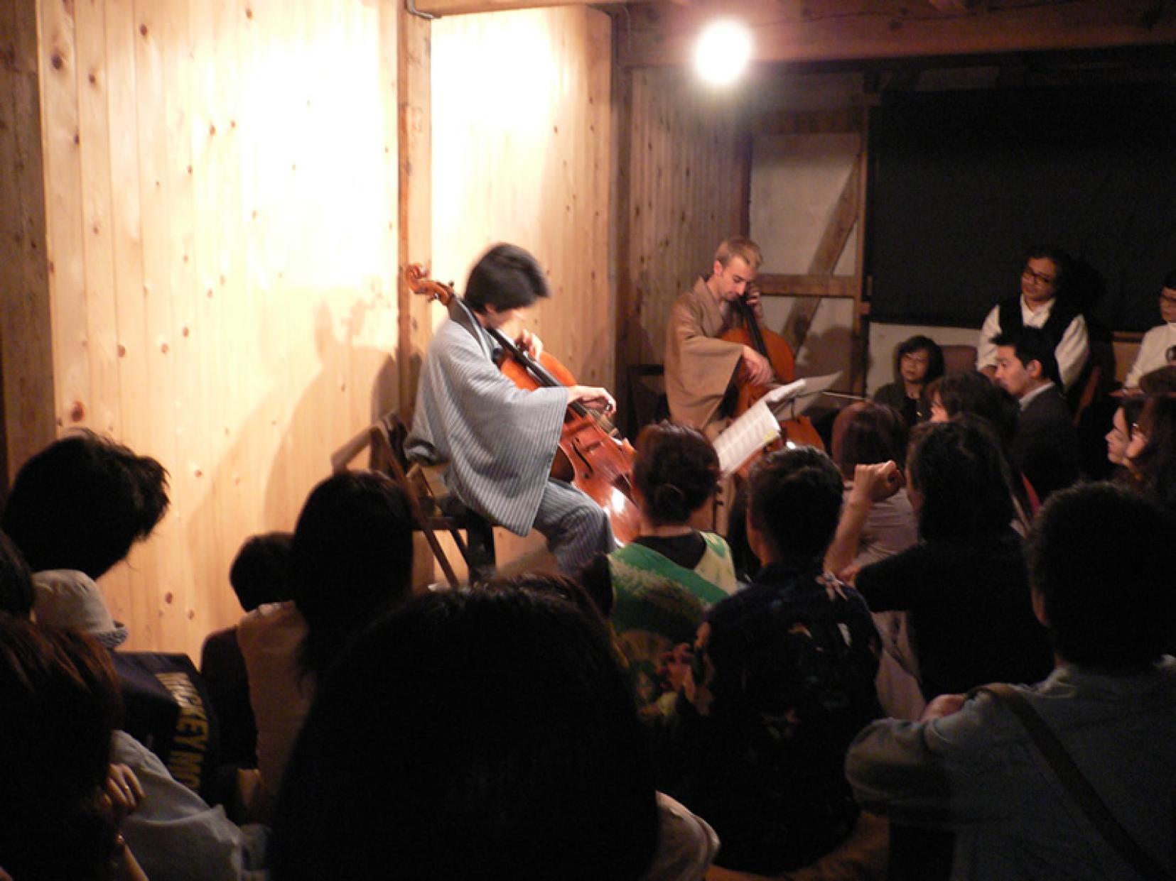 桜吹雪舞う青空のもと『蔵』に調和した着流しのチェロリストお二人の