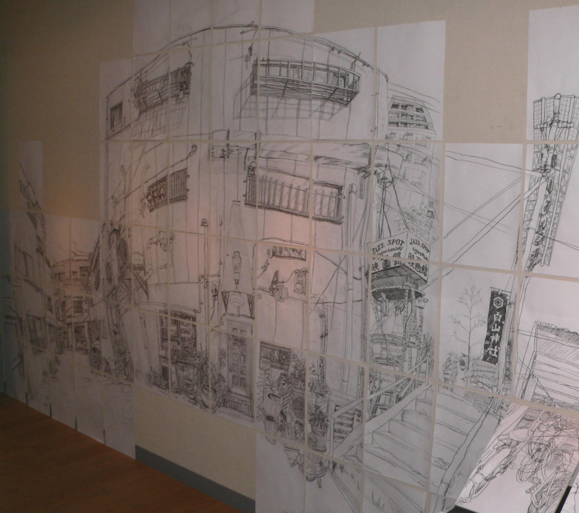 半切の画用紙に鉛筆のデッサン。緻密な画風で店内外がパノラマで描かれている。