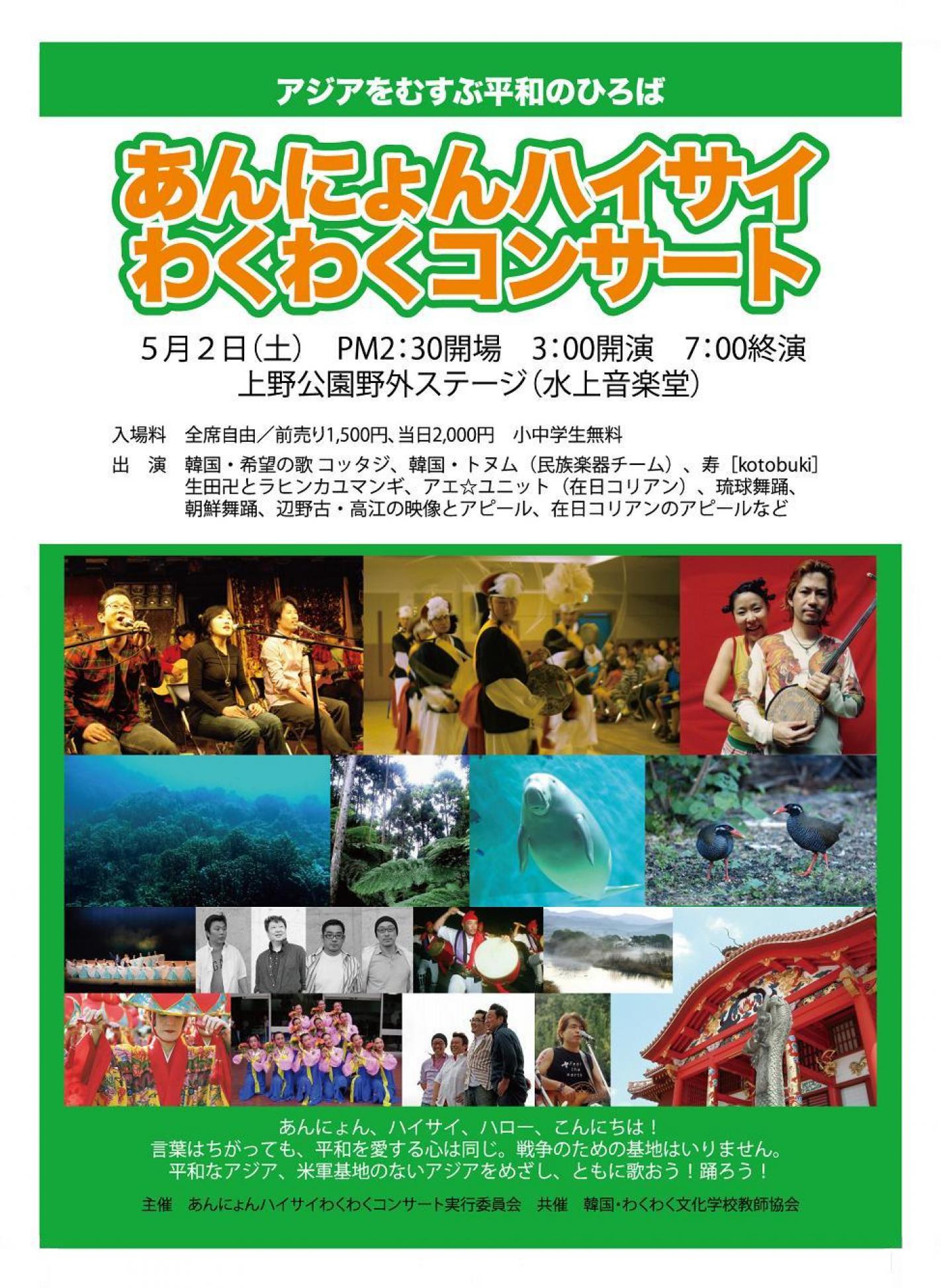 このコンサートは、韓国と沖縄の平和への闘いを歌や文化でむすび、平和なアジア、米軍基地のないアジアを目指します。